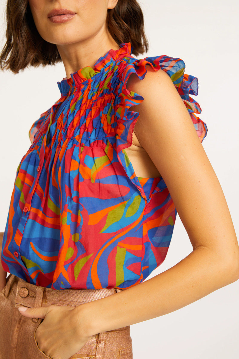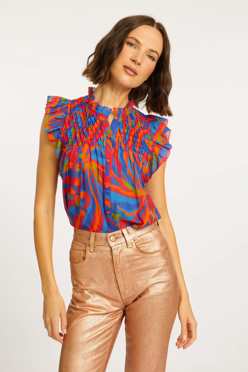 The Evelyn Top brings a flirty, tropical essence to your wardrobe. The relaxed button-up fit offers a comfortable and effortless look, while the smocking technique at the yoke area adds subtle texture and dimension to the top.