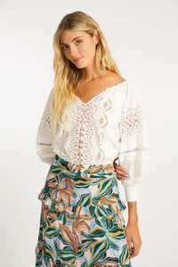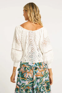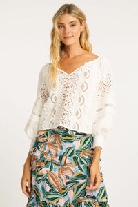 - Feminine lace pattern along the body, paired with airy blouson sleeves for a romantic, timeless look
