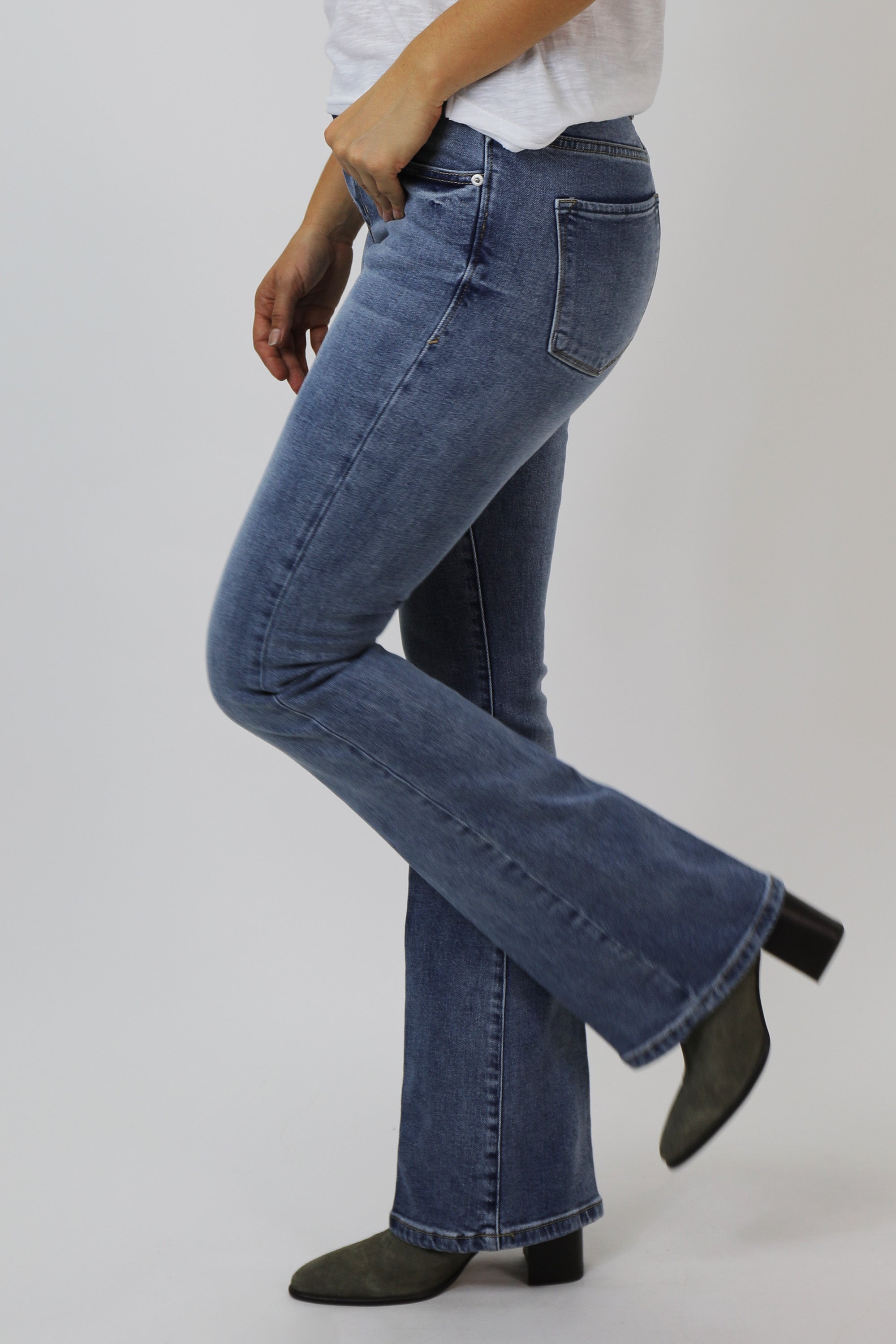 Mid rise clean hem flare jeans, the perfect blend of contemporary women's fashion and ultimate comfort. These versatile outfits are designed to offer a sleek and flattering silhouette, ideal for any occasion. With a comfortable mid-rise fit and full length, promising a polished look while allowing for effortless movement.