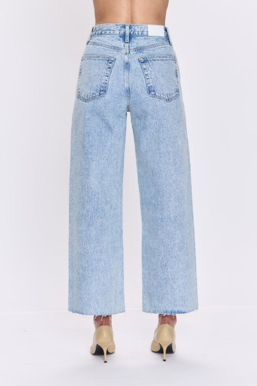 A modern take on a signature shape, Tate Crop sits high at the waist with a bowed wide leg and cropped 28" inseam, striking the balance between structure and ease. The curved leg adds soft dimension, while the wide cropped opening makes it endlessly versatile for pairing with boots or flats. Crafted from rigid non-stretch denim in Modena, a fresh light wash that channels effortless vintage cool.