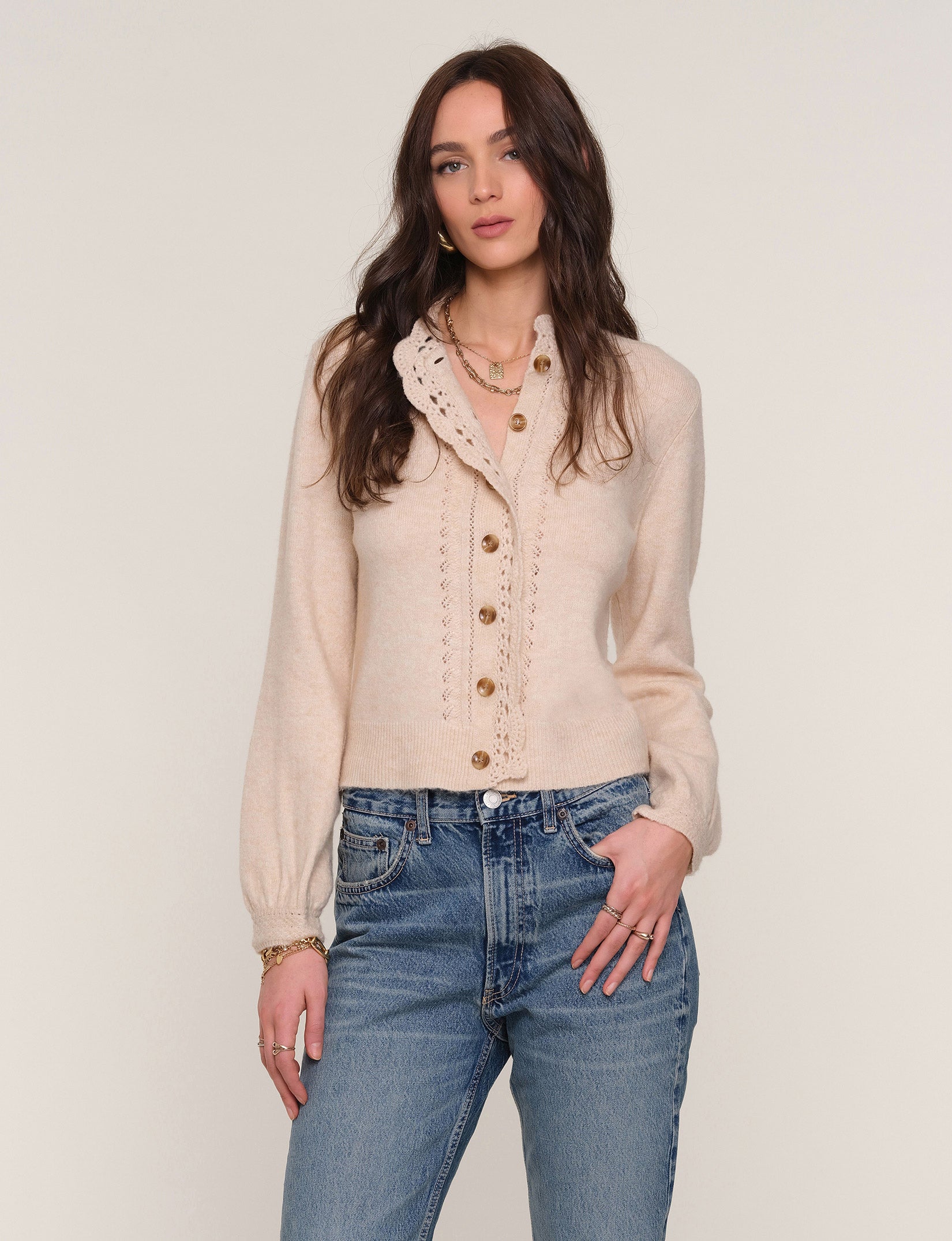 The Maudie Cardi is a Heartloom essential. Made from a super soft yarn, it features a slim fit, blouson sleeves and a crochet detail at the front opening edge. This will be a fall staple.