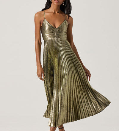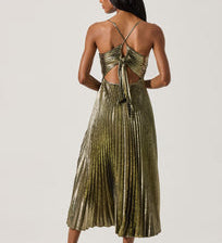 Blythe Metallic Plisse Midi Dress in Black Gold