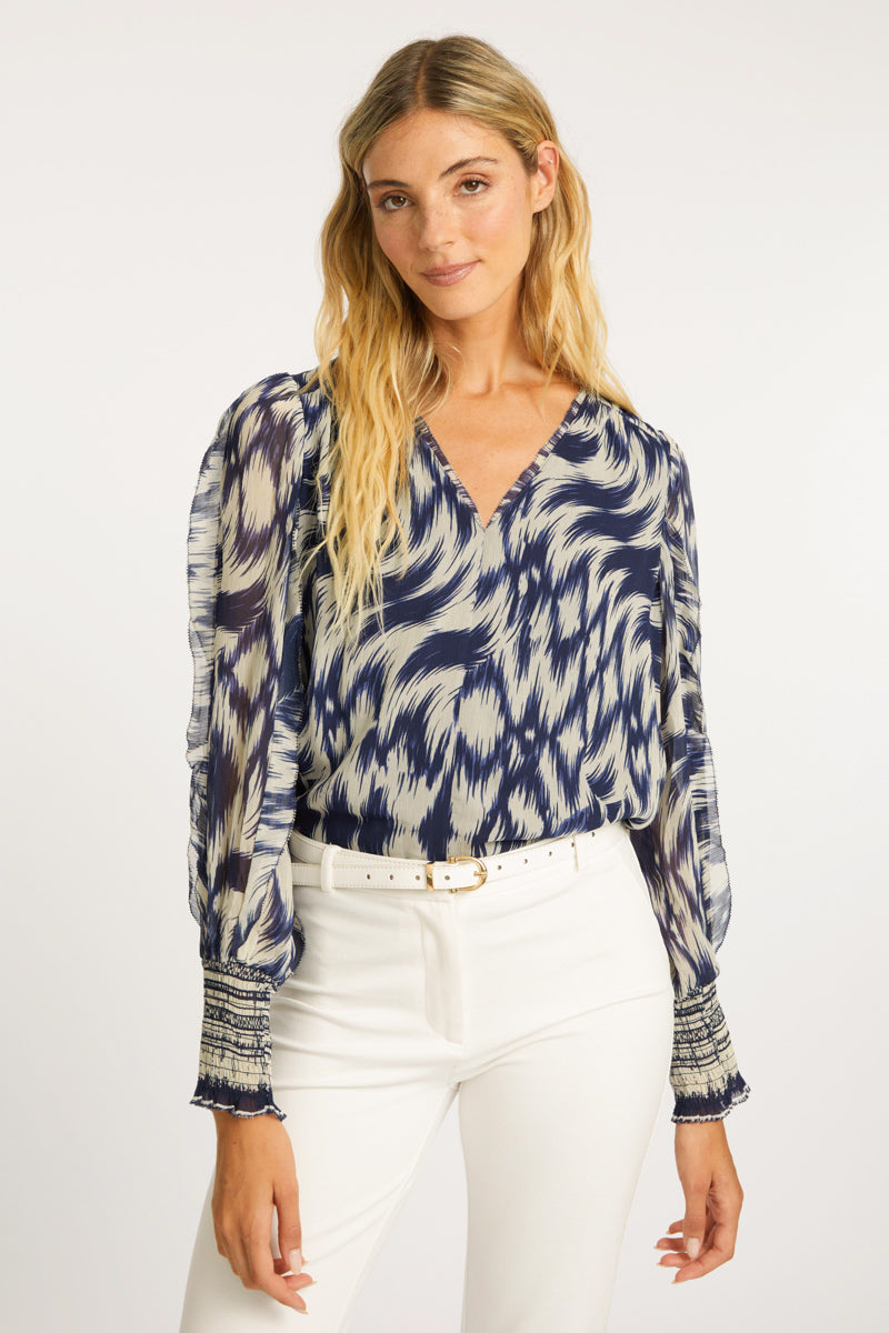 The Flora Top in the elegant Blue Katsuri print is a must-have for the season. Designed with long, billowy sleeves and finished with smocked cuffs, this top strikes the perfect balance between sophistication and ease. Its relaxed fit and lightweight viscose crinkly chiffon fabric make it an effortlessly chic choice for any occasion.