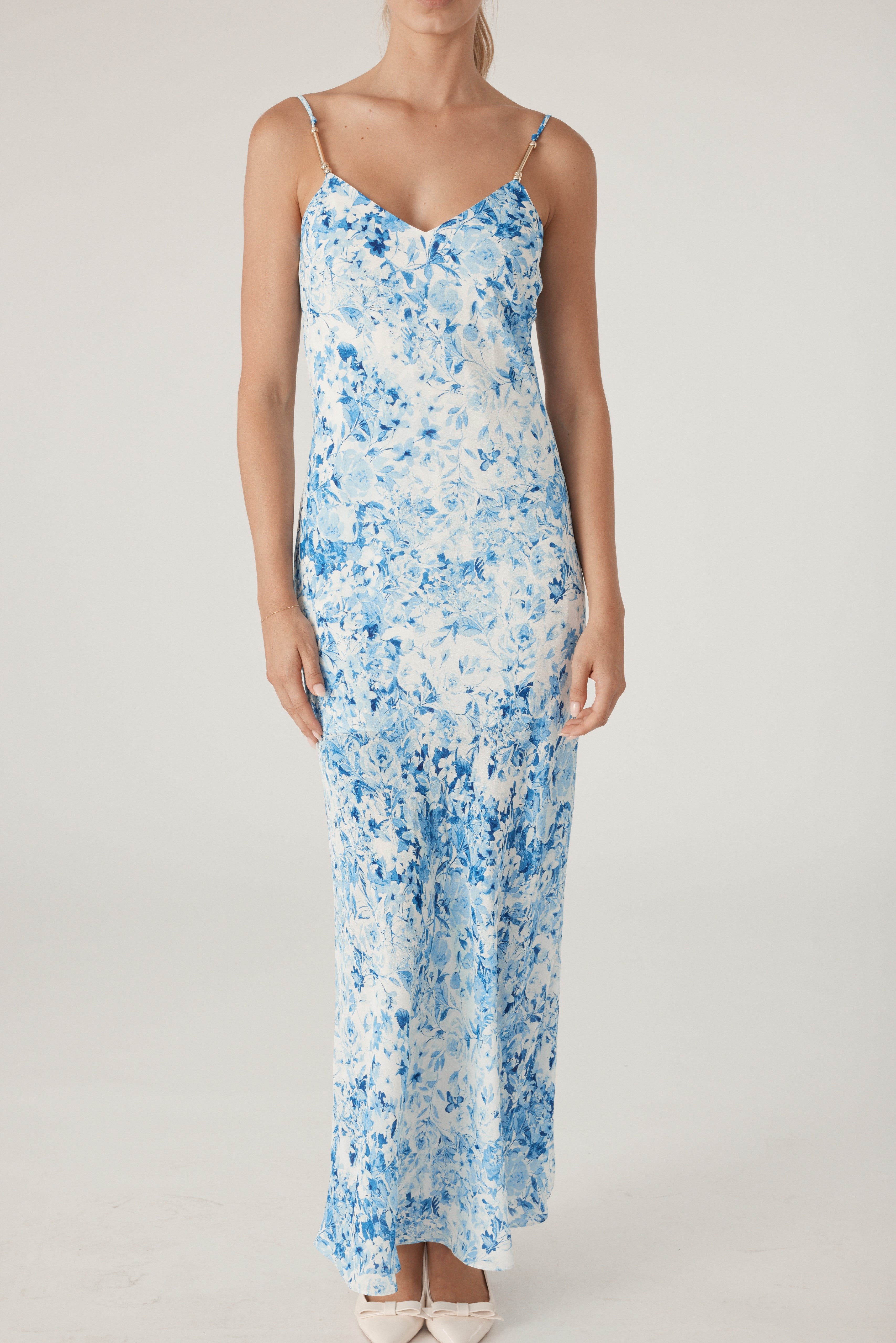 Crafted from floral vegan silk, this maxi dress features gold-trimmed cami straps and a flattering side slit for an effortlessly sophisticated look. A must-have addition to your spring wardrobe, it captures the perfect balance of grace and allure.