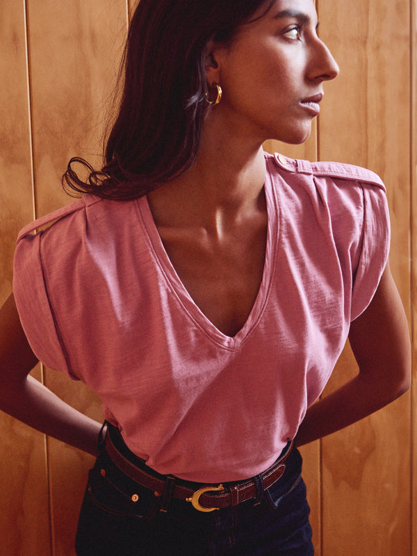 As easy as throwing it on and going. This one features a banded V-neckline, rolled sleeves, knife pleats with functional shoulder epaulets, and, to finish it all off, our signature gold shank buttons. Style tip: Tuck it in for a perfectly slouchy, perfectly undone look.