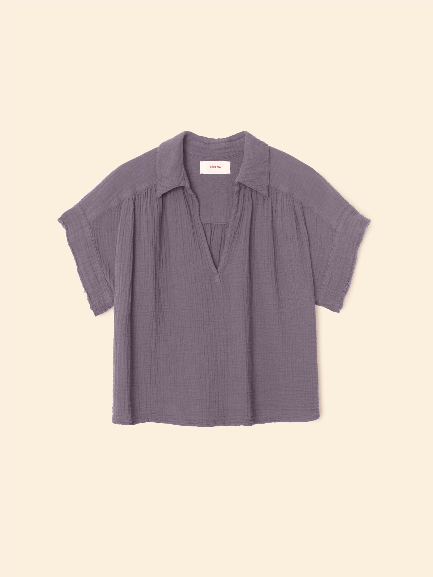 Play it cool. Reggie is new this season in washed double faced cotton gauze for a soft, gently crinkled feel. This easy pullover top has a slight crop and features a split neck, raw edge sleeves, and shirred front and back yokes.