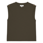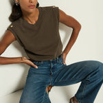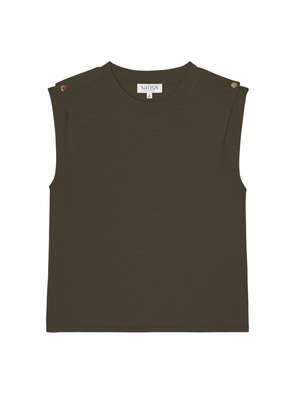 Thevsignature edgy muscle tee, with a little more flare-meet the Marina. Designed in cotton jersey, this tee features a relaxed bodice, our signature snap closure and crew neckline. This one comes in Espresso.