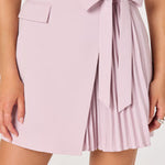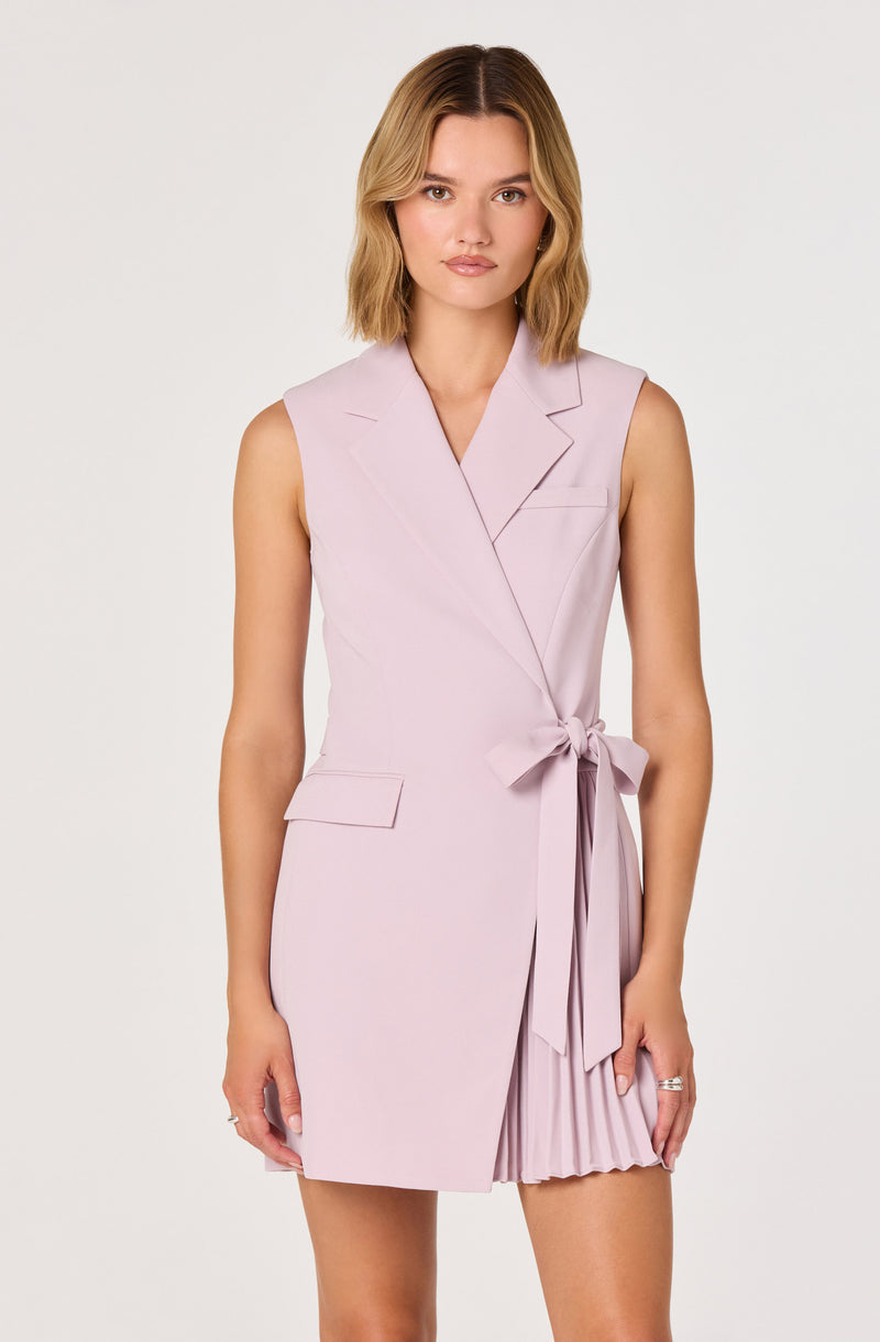 This sleeveless mini blazer dress transitions effortlessly from boardroom to happy hour with its tailored wrap silhouette and playful pleated skirt. The self-tie waist creates a flattering hourglass shape for confident, polished style.